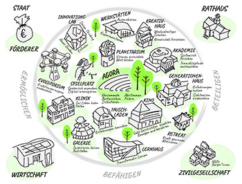 Die Gebäude und Räume des Transformationsquartiers stehen für Funktionen, deren Vorhandensein elementar dafür ist, dass die Transformation zur Nachhaltigkeit schneller, entschlossener, kooperativer, kreativer und mitreißender gelingen kann. Jedes Gebäude, jeder Raum hat einen spezifischen Fokus, erfüllt aber jeweils mehrere Funktionen. Viele Gebäude überschneiden sich in Ihren Funktionen – aus systemischer Perspektive ist das zwangsläufig und mehr noch: notwendig.
